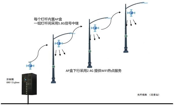 采用運(yùn)營商光纖網(wǎng)絡(luò)比無線4G更加穩(wěn)定,在不具備部署光纖的區(qū)域,可以使用4G微基站。采用5.8G信號在燈桿間做Mesh,同時(shí)提供下行2.4G頻段作為AP上網(wǎng)使用。